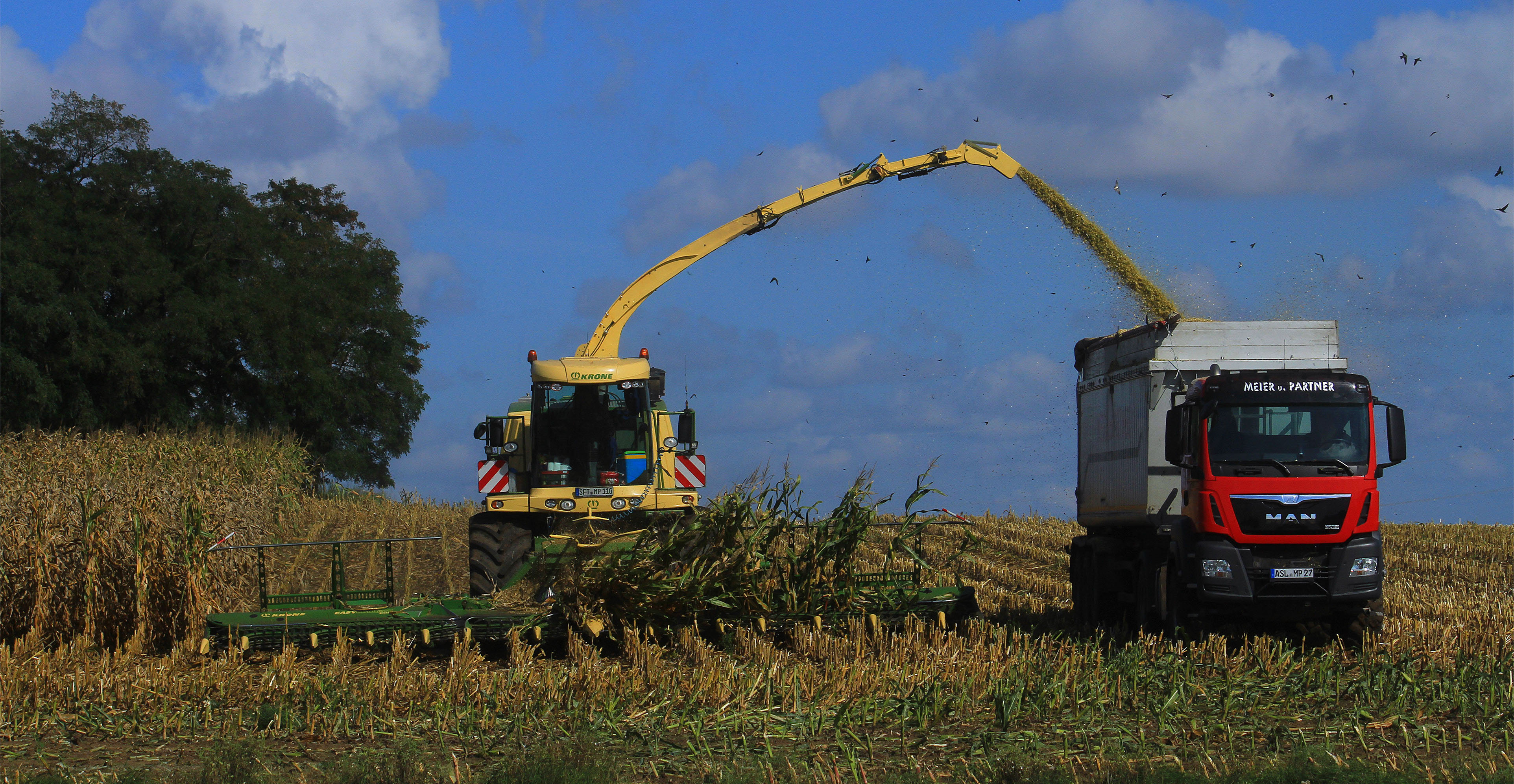 Meier-Agrarservice setzt mit leistungsstarken Feldhäckslern, schlagkräftigen Abfuhrgespannen auf einen reibungslosen und schonenden Ablauf der Erntekette.